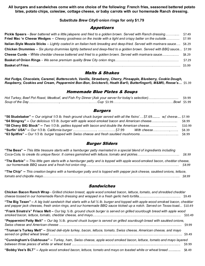 We hope you will visit us and enjoy a flashback to the 50's with delicious malts made with premium hand dipped ice cream, specialty burgers and sliders, sandwiches, wraps, salads, homemade soups and chili, all-day breakfast and lots of scratch-made home cookin'.