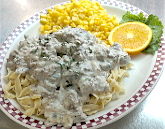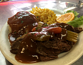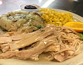 Oven roasted turket breast served over wheat bread with scratch-made mashed potatoes, turkey gravy, sweet corn and cranberries.